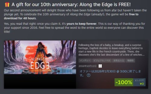 SteamにてAlong the Edgeを無料で配っています。