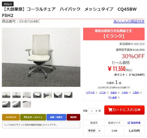肘掛けも付いて定価16万9,000円のところ、セール価格が1万1,550円。