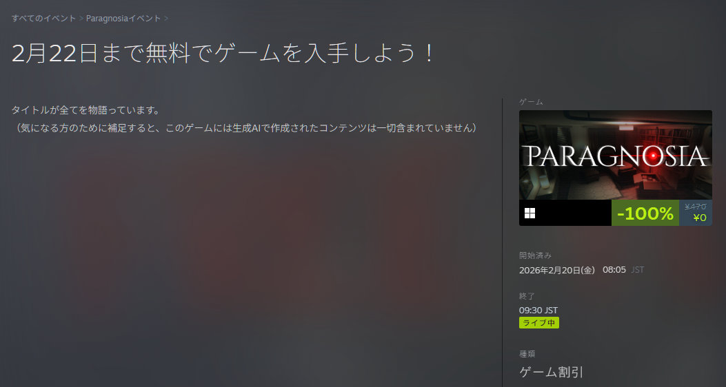 SteamにてParagnosiaを無料で配っています。
