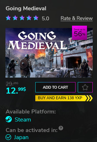 先月正式リリースされたばかりの Going Medieval が56%引きの12.99ドルとなっています。
